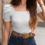 Rayas Elegantes, Camiseta con Cuello Cuadrado a Rayas, Top Casual de Manga Corta para Primavera y Verano