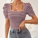 Playera de Rayas Vibrantes con Mangas Abullonadas - Elegante Cuello Cuadrado, Transpirable, Suave, Cómoda para Primavera y Verano - Ropa Casual para Mujeres para Actividades al Aire Libre